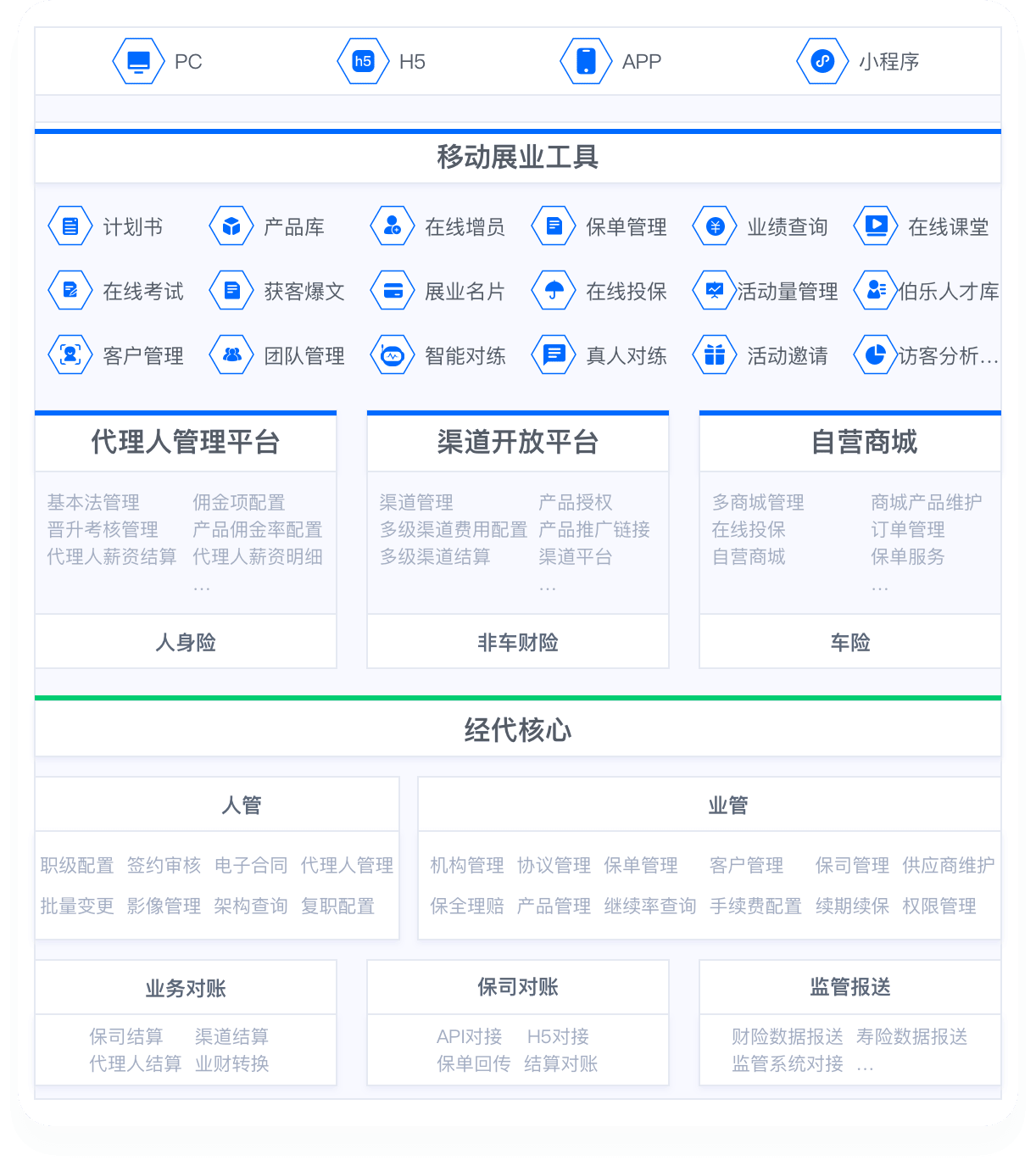 为保险公司提供从核心系统到前端服务的全链条线上化能力,助力迅速推进数字化升级。支持出单、保全批改、理赔等传统业务的同时,提供产品定制、渠道管理等服务,并提供快速渠道接入能力,满足高频、海量业务请求,全面提高客户服务能力与业务管理水平,提升客户体验。